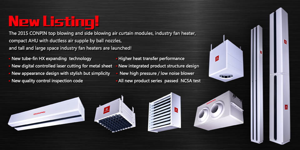 The 2015 CONPIN top blowing and side blowing air curtain modules, industry fan heater, compact AHU with ductless air supple by ball nozzles, and tall and large space industry fan heaters are launched!